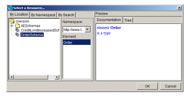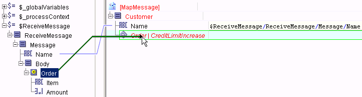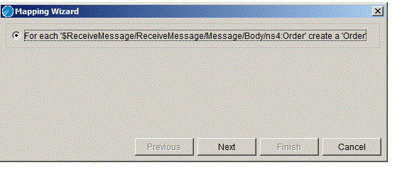3. Map the Name element to the Name element in the Activity Input area. Then, map the coerced Order element to the choice element in the Activity Input area.The Mapping Wizard dialog appears and asks if you wish to create an Order or a CreditLimitIncrease element. Select Order and click Next.The Mapping Wizard then asks you to create a For Each. Even though there is only one element in the Process Data schema (the Message element is not repeating), a For Each is used because this construct allows you to map the individual items of the Order element. Click Next to continue.