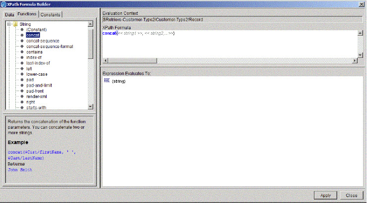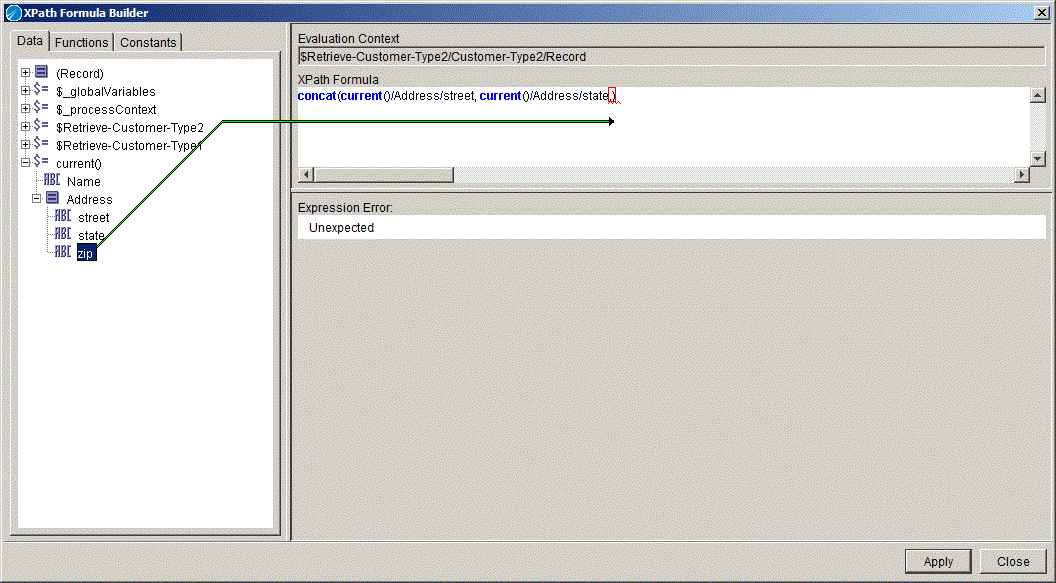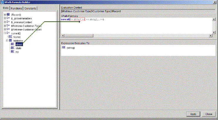 4. Select the Address element and click the XPath Formula Builder icon in the Input tab toolbar. In the XPath Formula Builder, drag a concat() function into the XPath Formula field. This function is used to concatenate the three elements in the Record element in the process data area to one Address element in the activity’s input.Click the Data tab, then drag the $current()/Address/street element into the << string1 >> placeholder in the concat() function.Drag the $current()/Address/state element into the << string2 >> placeholder in the concat() function. Then, add a comma to the end of the function to include a third string to concatenate. Drag the $current()/Address/zip element into the position of the third string in the concat() function.