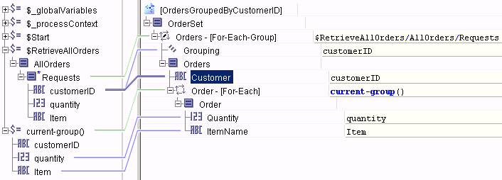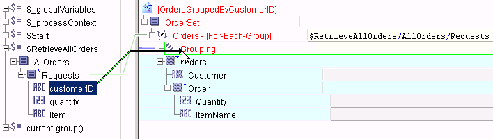 1. Choose the repeating element in the Activity Input schema that holds the grouped data. In this example, that element is Orders. Right-click on this element and choose Statement > Surround with For-Each-Group... from the pop-up menu. This is a shortcut to create a For-Each-Group statement with the Orders element as a child element and a Grouping statement to contain the element you wish to group-by.Adding the Grouping statement creates the $=current-group() element in the Process Data area. The Grouping statement creates the list grouped by the desired element, and the current-group() function allows you to access the items in the Requests repeating element that correspond to the group that is currently being processed.