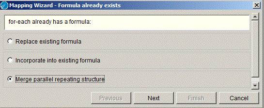 1. Map the first repeating element from the Process Data area into the Grades repeating element in the Activity Input area. In this example, the $RetrieveStudentIDs/Students/Record is the first repeating element.This brings up the mapping wizard with the default choice of creating a For-Each statement. Click Finish in the Mapping Wizard dialog to create the For-Each statement.The $=[index=] element contains the XPath formula position() to set the element with the current position number of the list item being processed. The $=[item=] element contains a statement to retrieve the item in the second repeating element that corresponds to the position of the item in the first list that is currently being processed.