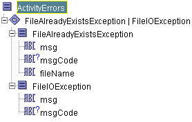 This activity can encounter the FileAlreadyExistsException or the FileIOException. TIBCO ActiveMatrix BusinessWorks Palette Reference describes the error schemas on the Error Output tab of all activities and lists possible causes for each error type. Refer to the description of each activity for more information about the Error Output tab.
