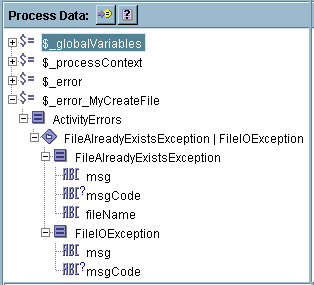 $_error_<activityName> process variable in subsequent activities after an error transition. The following illustrates the Process Data panel that is available after the activity named MyCreateFile encounters an error:
