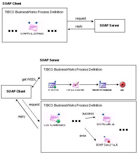 TIBCO ActiveMatrix BusinessWorks can act as a SOAP client and send SOAP requests to remote web services, or TIBCO ActiveMatrix BusinessWorks can act as a SOAP server and handle incoming SOAP requests. Figure 56 illustrates how the activities of the SOAP palette allow TIBCO ActiveMatrix BusinessWorks to send and receive SOAP requests.Figure 56 Activities in the SOAP paletteA TIBCO ActiveMatrix BusinessWorks process definition can perform a SOAP request operation using the SOAP Request Reply activity. In this case, the process acts as a SOAP client that sends a request to a web service. The web service is described in a WSDL file. You can retrieve WSDL files from well-known web service registries. See WSIL Files and UDDI Registries for more information.Once a WSDL file is retrieved, you can store and use the WSDL file in the project. You can view and manipulate the WSDL file with the WSDL palette. See TIBCO ActiveMatrix BusinessWorks Palette Reference for more information.