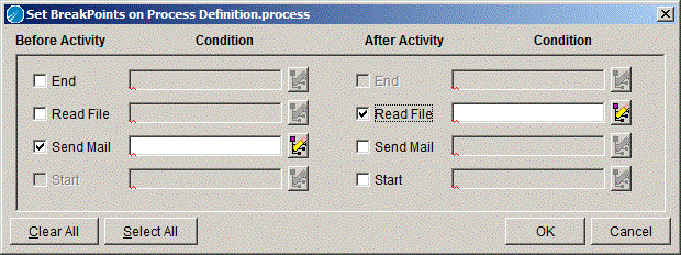 Figure 69 Set BreakPoints dialogWhen a breakpoint is set on an activity, a red octagon (a stop sign) appears next to the task’s icon to indicate the task has a breakpoint. A breakpoint before the activity appears to the top left of the activity. A breakpoint after the activity appears to the top right of the activity. Figure 70 illustrates a process diagram that has breakpoints set before and after two activities.Figure 70 Setting a breakpointWhen a process instance is stopped at a breakpoint, the breakpoint icon becomes a stop sign inside a yellow triangle to indicate where the process instance has stopped. Figure 71 illustrates the example process definition when the process instance is stopped at the breakpoint before the ReadFile activity.Figure 71 Process instance stopped at a breakpoint