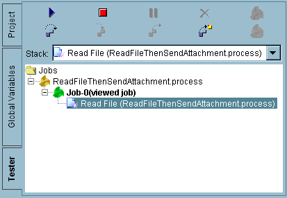 You can begin testing a process definition by selecting it in the project panel, then clicking the Tester tab to the left of the project panel. The project panel then becomes the test panel. The test panel displays process instances created during testing. Figure 72 illustrates the test panel.Figure 72 The test panelThe Start Testing Viewed Process button allows you to start process instances for one or more process definitions. You can select process instances in the test panel and display the process definition. See Process Instances During Testing for more information about process instances in the test panel.The test panel has several toolbar buttons for manipulating process instances. See Test Mode Buttons and Menus for a complete description of the buttons in the test panel.