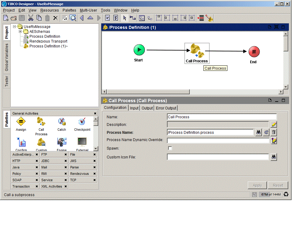 6. Click Apply.After you have added a LibraryBuilder resource to your project, you can use the resources defined in it. The resources display in the project view like other resources but, because they cannot be modified, they are greyed out and not editable.The next diagram shows a process that calls a process definition in the design-time library. The Process Name field points to the process definition in the design-time library.