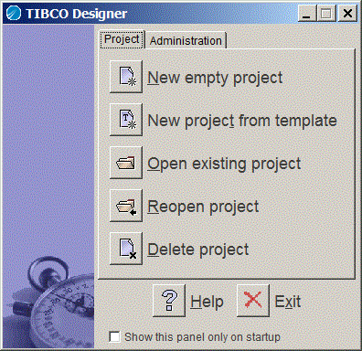 Figure 1 TIBCO Designer startup panelTable 1 describes the startup options. Table 2, Startup panel Administration options, describes the options available when you select the Administration tab.