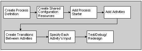 Figure 17 describes the general procedure for developing process definitions.Figure 17 Developing process definitionsSee TIBCO ActiveMatrix BusinessWorks Palette Reference for more details about each of the shared resources.