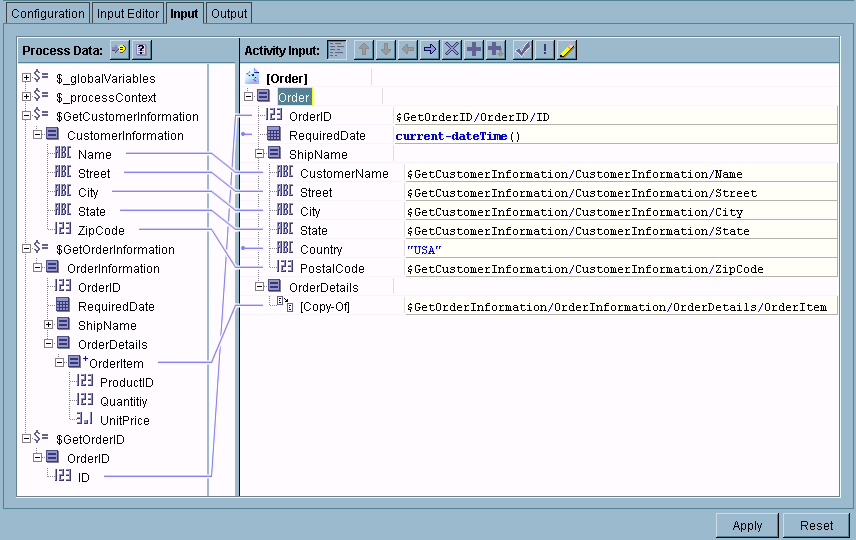 There are also several icons above the Activity Input area. Table 10 describes the icons and their function.See Chapter 8, Mapping and Transforming Data for more information about using the Input tab to create mappings between process data and the activity’s input.