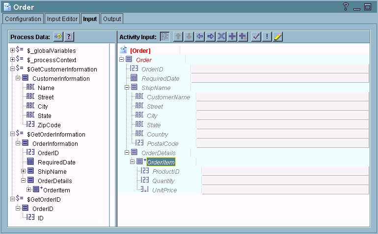 The Input tab of an activity allows you to supply the data that an activity expects as input. On the Input tab, you can see the available process data and the activity’s expected input. The process data and activity input are represented as schema trees. Figure 25 illustrates an activity’s Input tab.Figure 25 An activity’s input tabYou can also use your own XSLT templates to perform transformations instead of using the techniques described in this chapter. You can paste XSLT into your activity input or use the XSLT File shared configuration resource and the Transform XML activity. See TIBCO ActiveMatrix BusinessWorks Palette Reference for more information and examples of using XSLT to perform mapping.When an activity is first dragged from a palette to the design panel, the activity’s input elements are displayed as hints. These hints show you the data the activity expects as input. Each element can be required or optional. Required elements must have a mapping or formula specified. Once a mapping or formula is specified, a hint becomes an XSLT statement. See Statements, Hints, and Errors for more information about hints and statements.Most options in the Mapping Wizard dialog are straightforward. However, there are some complex scenarios that require multiple steps. Many of these situations are described in the section Examples of Mappings. You may also wish to refer to XSLT Statements for a reference of XSLT statements when deciding which XSLT statement can be used to achieve the result you desire.You can specify XPath formulas to transform an element if you need to perform more complex processing. The XPath Formula Builder allows you to easily create XPath formulas. For more advanced use of XPath, see Chapter 9, XPath. There are also a variety of third-party books and resources about XSLT and XPath.Once you specify a statement in the Activity Input panel and apply the change to the activity, it becomes part of the XSLT template used to create the activity’s input data. These statements are saved as part of the activity in the repository. Statements are only deleted if you manually delete them using the delete button, or if you use the Mapper Check and Repair button to automatically fix errors. Therefore, if the input schema for the activity changes, your statements may no longer be valid. See Repairing Incorrect Mappings for more information about using the Mapper Check and Repair button to fix statements in the activity’s input.Any statement or hint that has an error is displayed in red. A hint is only displayed in red if it is a required input element. All required input elements must have statements specified. If a statement is red, you must fix the error before executing this process definition. The Mapper Check and Repair button can help you automatically fix some errors. See Repairing Incorrect Mappings for more information about fixing errors.