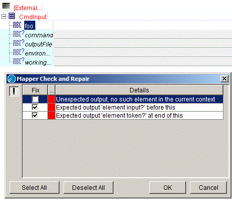 token has been removed. The Mapper Check and Repair dialog displays these problems with the Fix checkbox checked. You can select or clear the Fix checkbox for each item, depending upon whether you wish to fix the problem or leave the problem until a later time. When you click OK, any items that are marked for fixing are repaired.