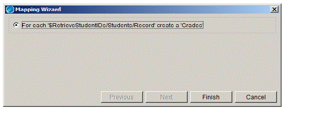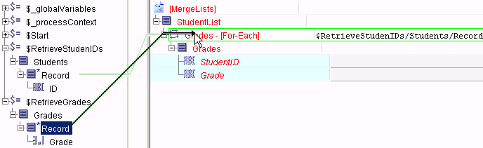 1. Map the first repeating element from the Process Data area into the Grades repeating element in the Activity Input area. In this example, the $RetrieveStudentIDs/Students/Record is the first repeating element.This brings up the mapping wizard with the default choice of creating a For-Each statement. Click Finish in the Mapping Wizard dialog to create the For-Each statement.The $=[index=] element contains the XPath formula position() to set the element with the current position number of the list item being processed. The $=[item=] element contains a statement to retrieve the item in the second repeating element that corresponds to the position of the item in the first list that is currently being processed.