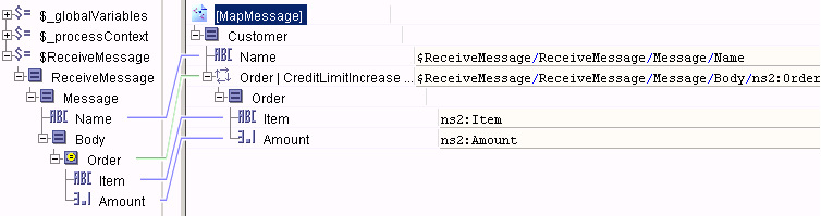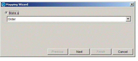 3. Map the Name element to the Name element in the Activity Input area. Then, map the coerced Order element to the choice element in the Activity Input area.The Mapping Wizard dialog appears and asks if you wish to create an Order or a CreditLimitIncrease element. Select Order and click Next.The Mapping Wizard then asks you to create a For Each. Even though there is only one element in the Process Data schema (the Message element is not repeating), a For Each is used because this construct allows you to map the individual items of the Order element. Click Next to continue.