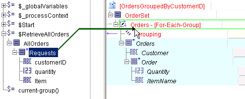 1. Choose the repeating element in the Activity Input schema that holds the grouped data. In this example, that element is Orders. Right-click on this element and choose Statement > Surround with For-Each-Group... from the pop-up menu. This is a shortcut to create a For-Each-Group statement with the Orders element as a child element and a Grouping statement to contain the element you wish to group-by.Adding the Grouping statement creates the $=current-group() element in the Process Data area. The Grouping statement creates the list grouped by the desired element, and the current-group() function allows you to access the items in the Requests repeating element that correspond to the group that is currently being processed.