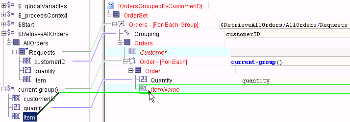 5. Map the remaining element from the current-group() element into the desired element in the For-Each group. In this case, quantity would map to Quantity automatically, and Item must be mapped to ItemName.