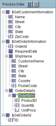 The process data area of the example input tab illustrates the output schema of the activities in the process. There are three output schema, each a root node in the process data area: GetCustomerInformation,