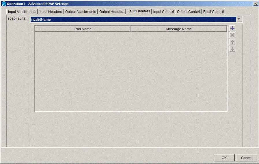 • Outbound Fault Message Policy - for applying security policy to the fault messages being sent.This feature enables the user to configure headers for declared faults. With this the user will be able to configure different schemas to be mapped to the headers for different Fault messages. A Fault Headers tab (Figure 48) has been added to the Advanced SOAP Settings. You can map the context resource values to the configured header using the Fault Headers tab.Figure 48 Fault HeadersTo configure headers for a fault message, as shown in Figure 49, for example, configure headers in the context resource in the same way they were configured in the headers for declared Fault: