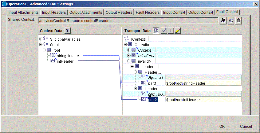 Figure 52 Context ResourceFigure 53 Mappings on Fault ContextFigure 54 Mapping Configured HeadersIn the Implementation process before sending the invalidName fault, use the Set Context Activity and configure values as shown in Figure 55.Figure 55 Implementation Process