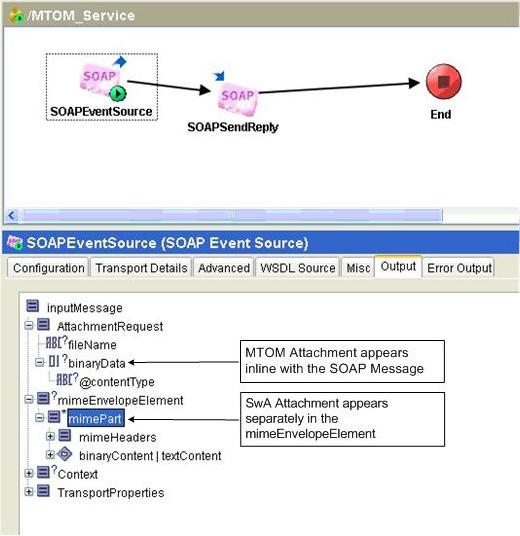 See TIBCO ActiveMatrix BusinessWorks Palette Reference for more information about the resources in the SOAP palette.SOAP messages can have message parts that contain attachments. For a message part to contain an attachment, specify the Special Type in the Type field of the Part Details section of the Message resource when creating a WSDL file configuration. See TIBCO ActiveMatrix BusinessWorks Palette Reference for information about creating WSDL files.SOAP clients that send messages with attachments must conform to the SOAP Messages with Attachments specification (http://www.w3.org/TR/SOAP-attachments).Message Transmission Optimization Mechanism (MTOM) provides another way of sending binary content or attachment processing by serializing SOAP messages with attachments. This is available only with SOAP verion 1.2. Optimization is only available for element content that is in a canonical lexical representation of xs:base64Binary data type. Message Transmission Optimization Mechanism (MTOM) conforms to the specification http://www.w3.org/TR/soap12-mtom.For an outbound SOAP Message with MTOM attachments sent by SOAP Request Reply or SOAP Send Reply activities, any element of type xs:base64Binary (or an extension of xs:base64Binary) in the SOAP response message is treated as an MTOM attachment and appears as a separate MIME part on the wire.Content-ID: <http://example.org/me.png>Content-ID: <http://example.org/my.hsh>Although the attachment is transmitted outside the SOAP message with a reference to it, the attachment appears as if it’s embedded in the SOAP message. The binary content or the attachment is a part of the SOAP Infoset. MTOM-style attachments are available inline with the SOAP message at as shown in Figure 57.Figure 57 MTOM Attachment