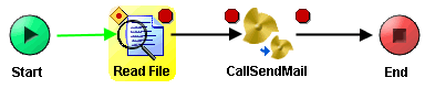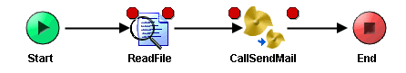 Figure 69 Set BreakPoints dialogWhen a breakpoint is set on an activity, a red octagon (a stop sign) appears next to the task’s icon to indicate the task has a breakpoint. A breakpoint before the activity appears to the top left of the activity. A breakpoint after the activity appears to the top right of the activity. Figure 70 illustrates a process diagram that has breakpoints set before and after two activities.Figure 70 Setting a breakpointWhen a process instance is stopped at a breakpoint, the breakpoint icon becomes a stop sign inside a yellow triangle to indicate where the process instance has stopped. Figure 71 illustrates the example process definition when the process instance is stopped at the breakpoint before the ReadFile activity.Figure 71 Process instance stopped at a breakpoint
