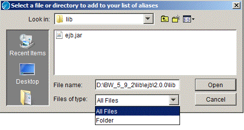 − If you select the Classpath check box, the jar file or file represented by the alias is placed in the CLASSPATH when the enterprise archive file is built. Note that, at design-time, the referring resource is responsible for loading these entries itself. Designer does not perform anything with the configuration other than building the enterprise archive file.