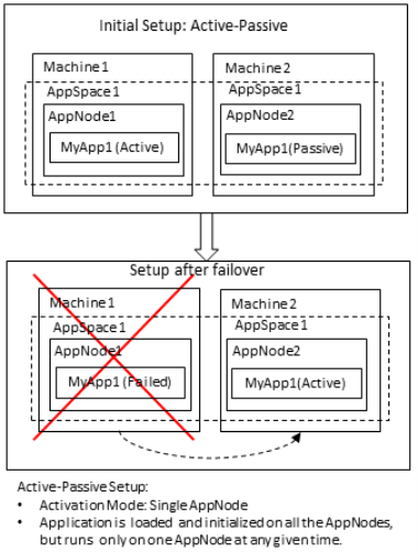 - If an AppNode that has an application in active state fails, another AppNode that has an application in the passive (stand-by) state takes over and starts processing requests.