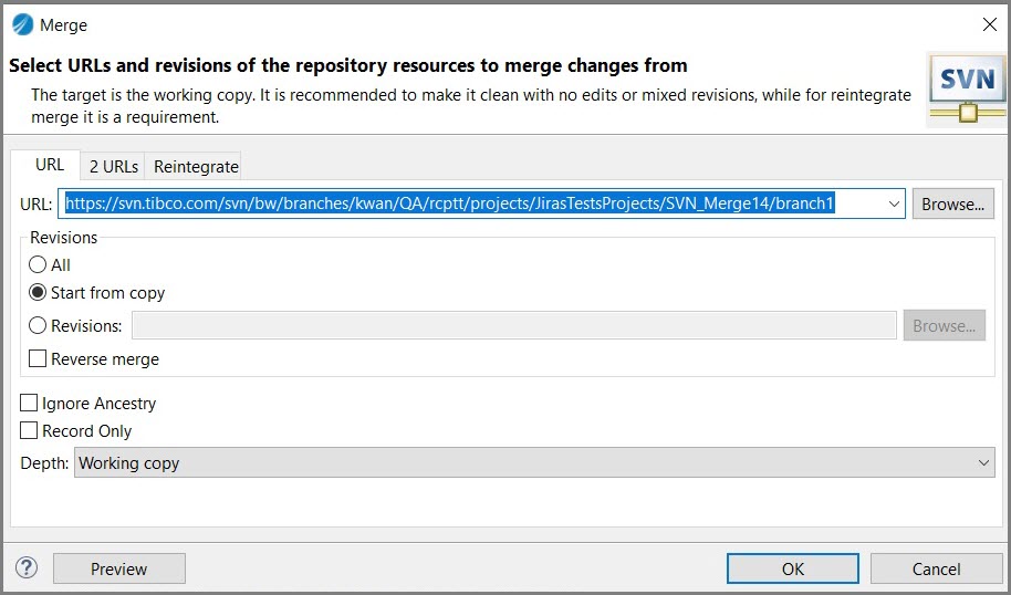 To use SVN merge, ensure the SVN plug-in is installed. To install the plug-in, see Configuring TIBCO Business Studio for BusinessWorks with SVN plug-in.