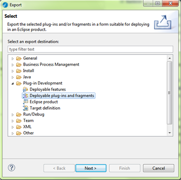 Select the Install into host Repository radio button on the Deployable plug-ins and fragments screen and click Finish.