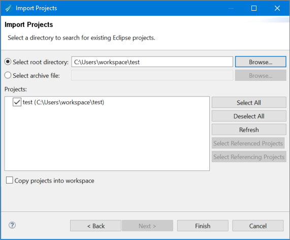 Browse For Folder wizard is displayed.Note: If you want to import the projects in a .zip file, select the Select archive file option, and then click the Browse button next to the Select archive file: option. Or copy and paste the path of the required .zip file in the Select archive file: input field.