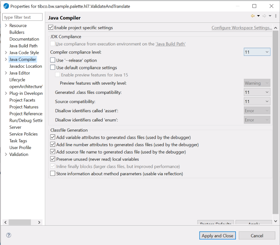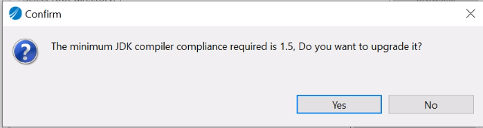 Important: The minimum JDK compiler compliance required is 1.5. If the project that you are importing with Java nature has JDK compiler compliance less than 1.5, TIBCO Business Studio for BusinessWorks imports the project as it is and you may see Java-related problems in your project. You can then choose to upgrade the JDK compiler compliance version to the one greater than 1.5 by clicking the Yes button on the Confirm window. When you click Yes, the default Java version of the environment is set to 11.