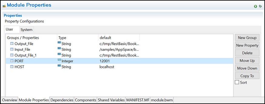 The Module Properties editor can be used to create and manage module properties. You can add a new property or logical groups which you can use to organize module properties.