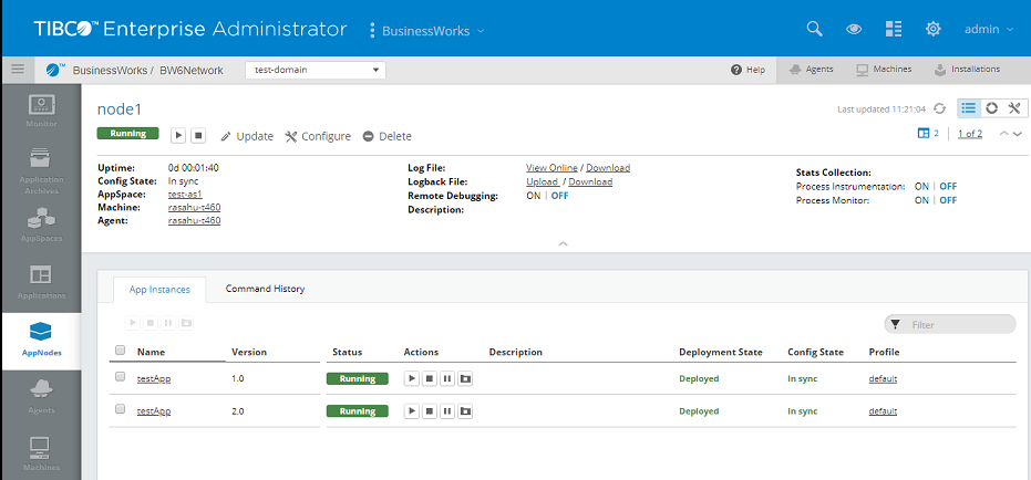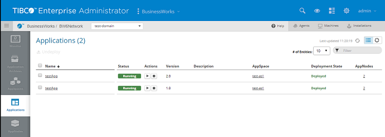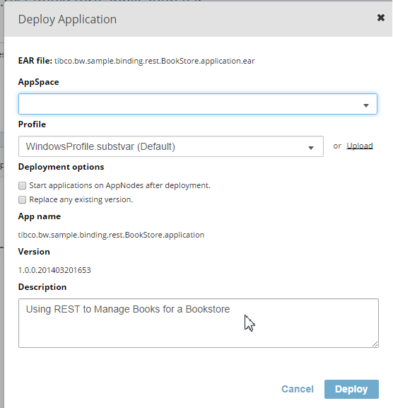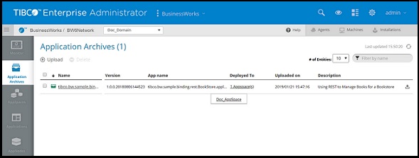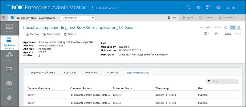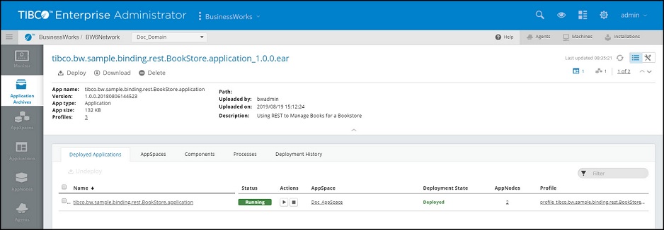 BW_HOME\bin>bwadmin deploy -d MyDomain -a MyAppSpace tibco.bw.sample.binding.rest.BookStore.application_1.0.0.ear