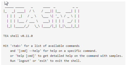 At any time in the TEA shell, press the tab key for a list of supported commands available for the context. To get help on a command, type the command with the --help option, for example: create --help