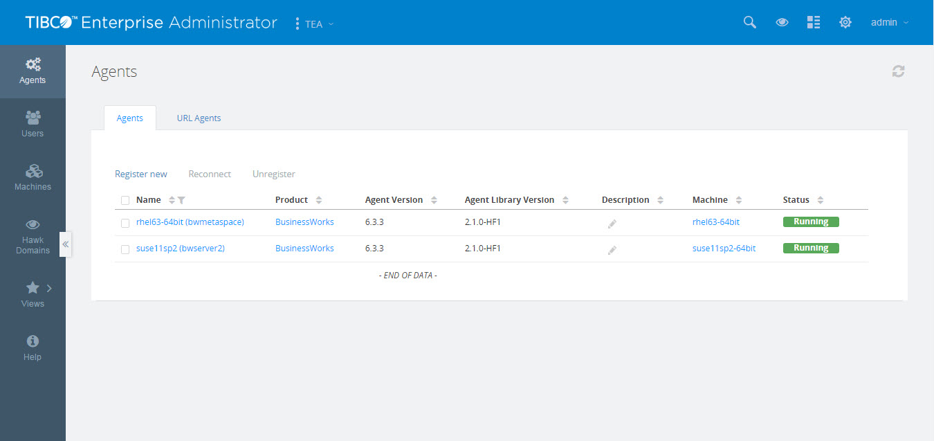 For an agent network to be managed from the Admin UI, one bwagent in the agent network must be registered with the TIBCO Enterprise Administrator server. If the registered bwagent terminates, the connection between the server and the agent network is automatically recovered. Another bwagent in the agent network is automatically registered with the server.