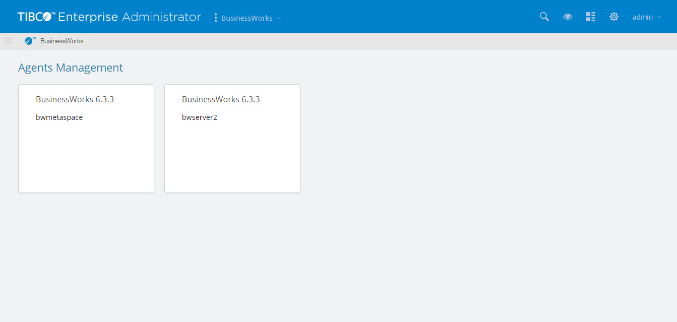 The Admin UI is a web UI that runs in TIBCO® Enterprise Administrator (TEA). To enable the Admin UI, the bwagent must be registered with a running TEA server. Use the Admin UI to create, view, and monitor runtime entities.