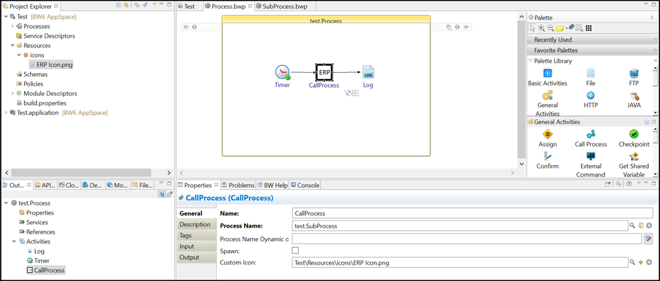 The custom icon is set to the Call Process activity. The custom icon path is also changed to the path as per your process module location in the following form: