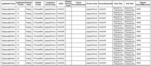 APPENDER: File Appendersection of the logback.xml file.<appender name="processinstanceStatsFileAppender" class="ch.qos.logback.core.FileAppender"> <File>../log/processinstancestats.html</File> <encoder class="ch.qos.logback.core.encoder.LayoutWrappingEncoder"> <layout class="com.tibco.bw.logback.layout.ProcessInstanceStatsHTMLLayout"/> </encoder> </appender> <logger name="com.tibco.bw.statistics.activity" additivity="false"> <level value="INFO"/> <appender-ref ref="processinstanceStatsFileAppender" /> </logger>Results look similar to this: