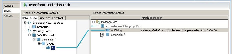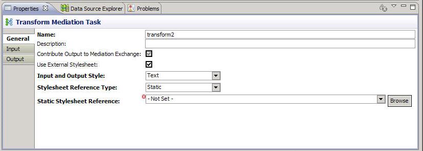 Note: Contribute Output to Mediation Exchange is automatically selected for this type of transformation, which prevents the MessageData from being overwritten when an external transformation is used. Also, the input and output of the transformation task always match the Input Style you select. For example, if the input is text, the output is also be text. -