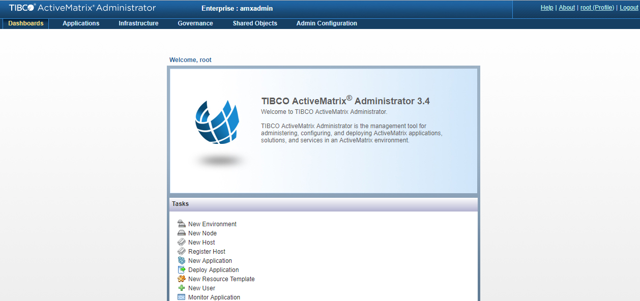 The Administrator web interface provides access to all TIBCO ActiveMatrix Administrator functions.