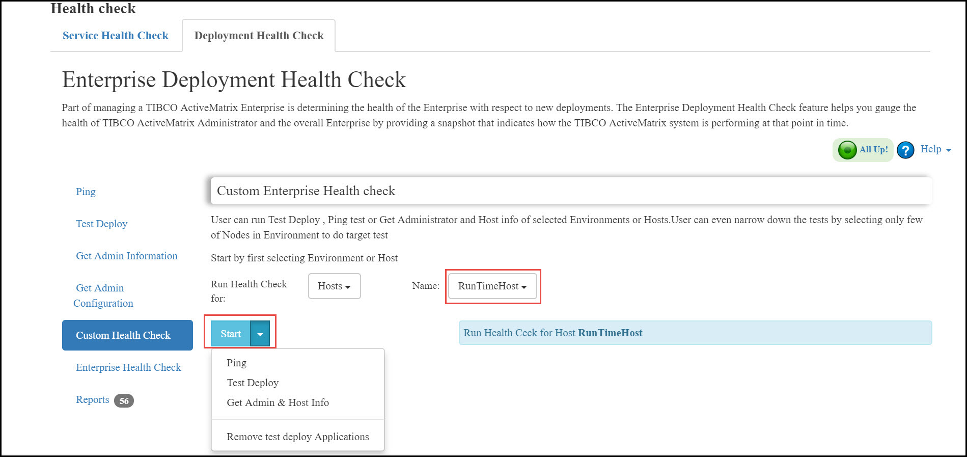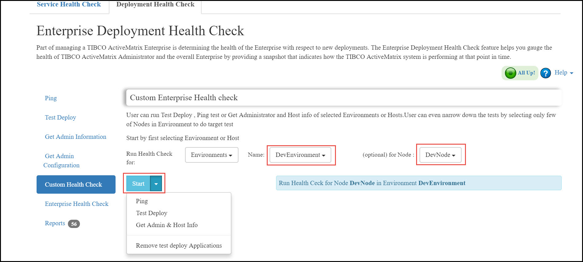 - Test Deploy: Test Deploy for all the nodes managed by the selected environment (Deploy a sample application and then undeploy it)
