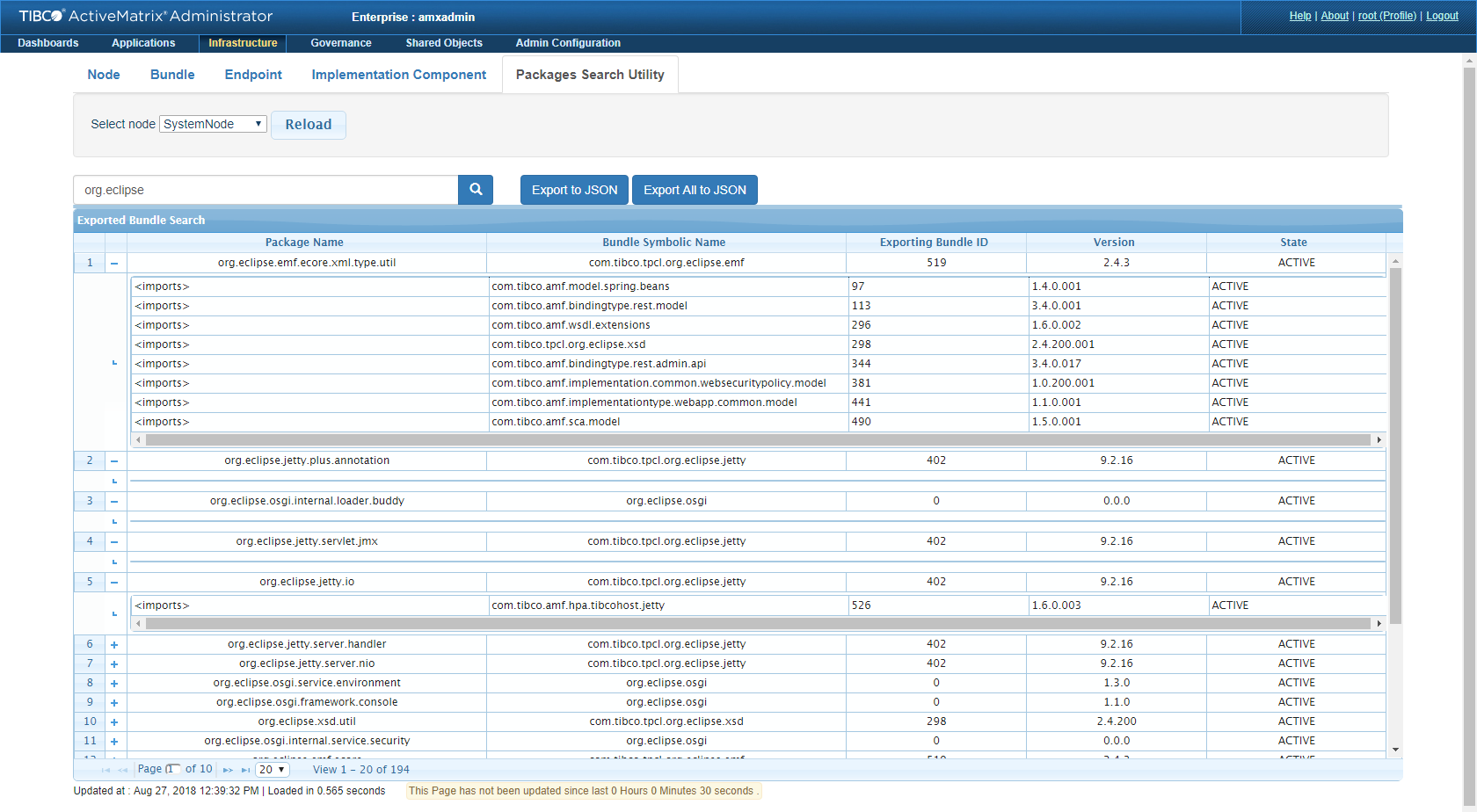 You can export the hierarchy of all the OSGi packages to a .json file. After the search results are displayed, click Export All to JSON.