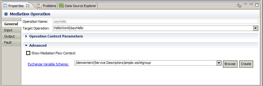 Exchange variables are defined in the Advanced section of the properties view of a mediation operation.