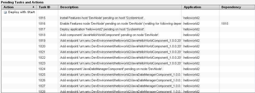 The Administrator server also stores all the tasks with no outstanding dependencies associated with an action on persistent queues in the notification server. For example, the following screen lists some of the pending tasks for a deploy action: