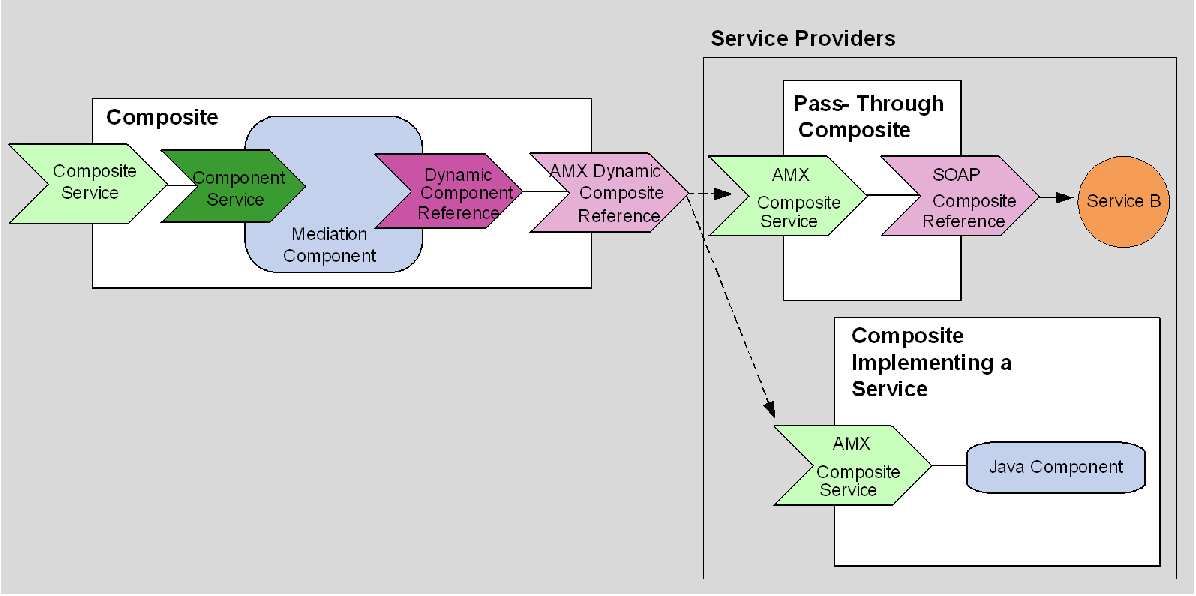 The diagram shows a dynamic composite reference using a composite that implements a service and also using a pass-through composite for referencing a SOAP service.