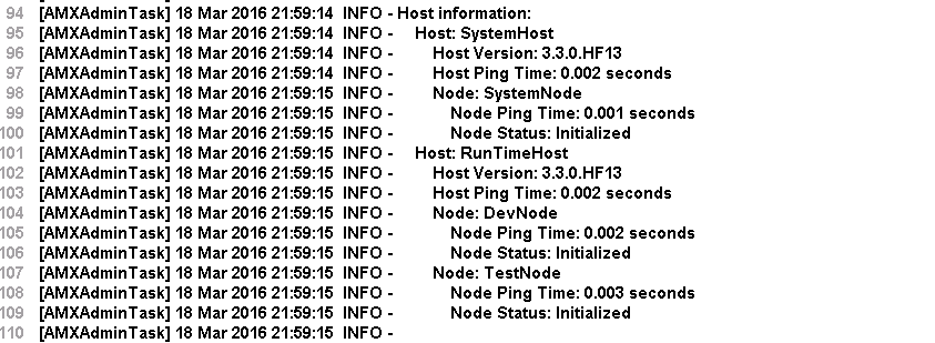 Above CLI snippet shows the time taken for the TIBCO ActiveMatrix Administrator to ping each Host in the Enterprise, and the time taken, in turn, for the Host to ping each managed Node. In addition, the Host's version and the Node's Initialization status is displayed.