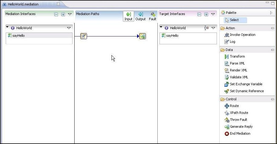 The following figure shows a Hello World mediation flow containing a log task opened in the Mediation Editor.