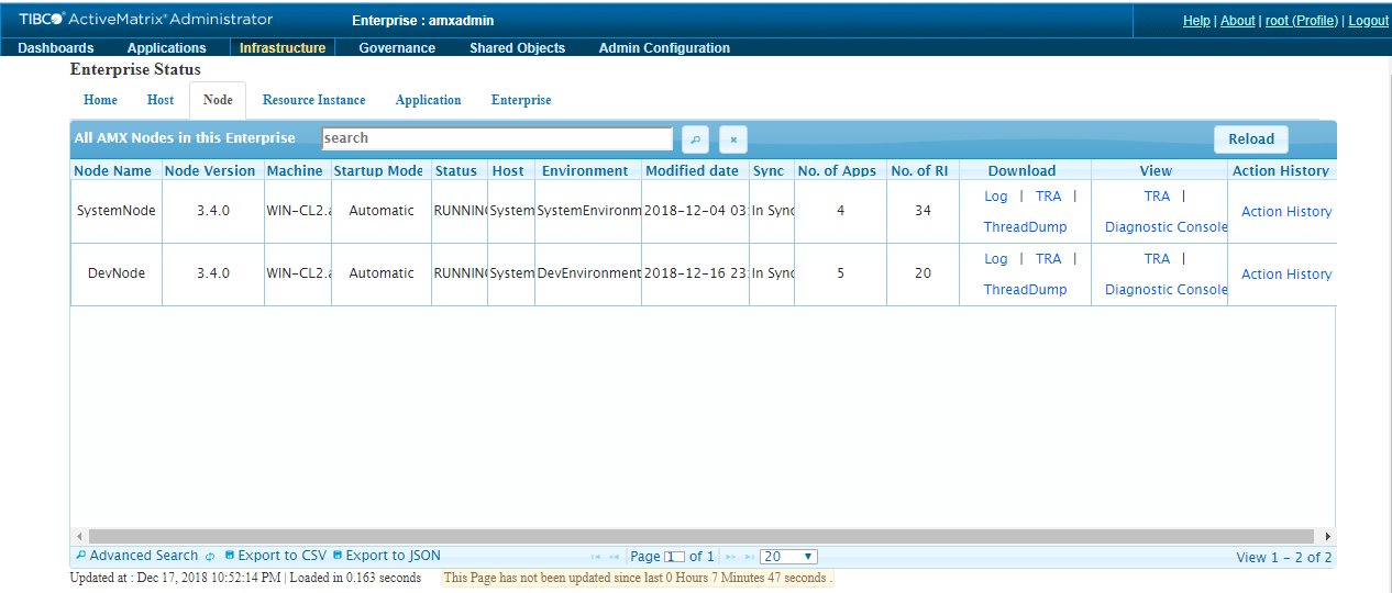 • For Nodes created prior to setting the java.property.com.tibco.admin.nodeservice.duplicate.node.name property to true, you may not be able to view or download the Node's TRA file as these Nodes are not managed by ActiveMatrix Administrator. TIBCO Configuration Tool (TCT) must be run to create a new Enterprise and all Nodes created prior to applying the property (except the SystemNode) must be deleted.