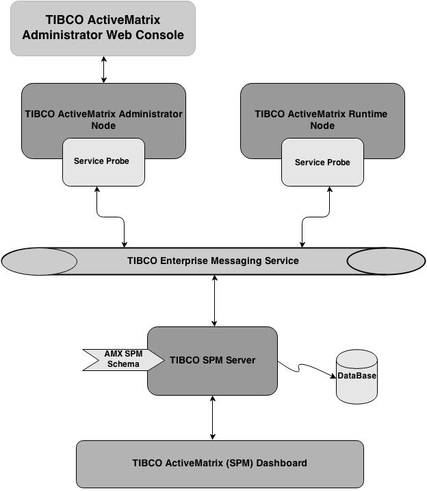 After the service probe is enabled on any TIBCO ActiveMatrix node, statistics are emitted periodically to the TIBCO Service Performance Manager server asynchronously via EMS. Additionally, the TIBCO ActiveMatrix Administrator node also emits asset status.
