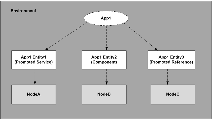 In the above figure, consider that different entities of a single application (App1) need to be deployed across different nodes. Entity1 (a promoted service) needs to be deployed to NodeA, Entity2 (a component) needs to be deployed to NodeB, and Entity3 (a promoted reference) needs to be deployed to NodeC. A messaging bus is required in this case.
