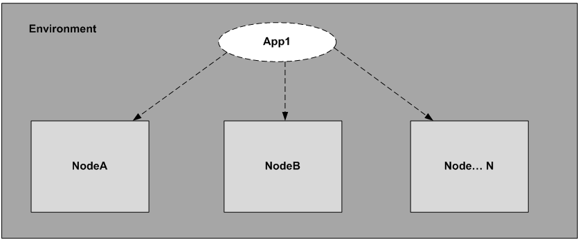 In the above figure, consider that a single application (App1) needs to be deployed across all the nodes (NodeA, NodeB, Node...N) in the environment. Consider that all the components of App1 run on all the nodes all the time and none of the application entities (such as component, service, binding, reference, and so on) are distributed across multiple nodes. A messaging bus is not required in this case. For scenarios like these, you can deploy an application even when the messaging bus is down or not available.